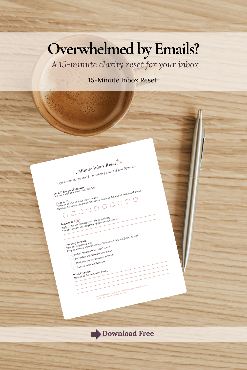 The 15-Minute Inbox Reset is a free, printable tool for women who feel buried in email overload. In just 15 minutes, you’ll regain clarity and take back control of your inbox.